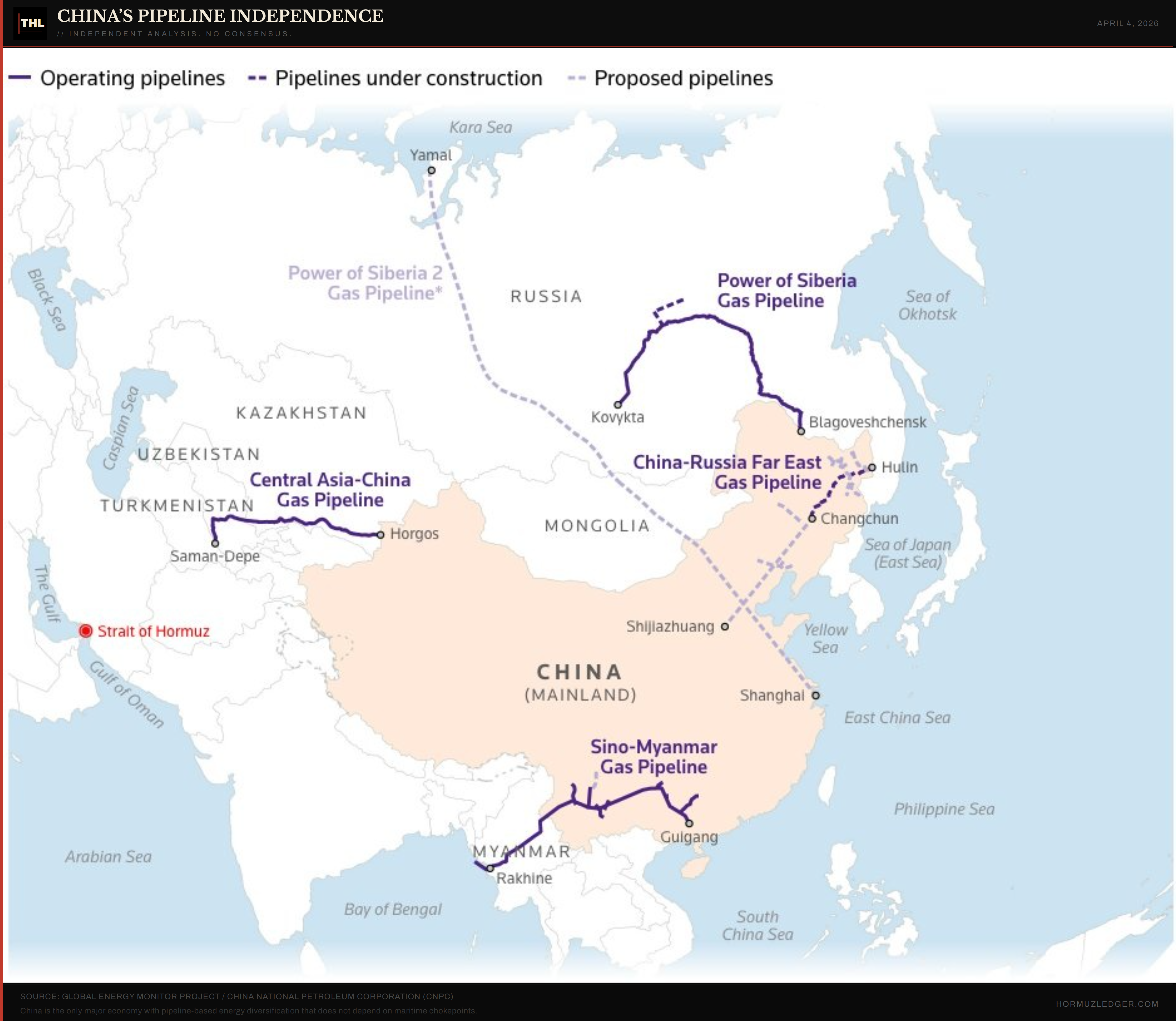 The infrastructure layer sits beneath the diplomatic one: China is the only major economy with pipeline based energy diversification that does not depend on maritime chokepoints: the power of Siberia from Russia — operating, central Asia-China pipeline from Turkmenistan — operating, Sino-Myanmar pipeline bypassing the Malacca Strait — operating, the power of Siberia yet again — under negotiation. This is why China can absorb the strategic patience of watching its LNG imports collapse to 8 year lows. It has alternatives that Japan, South Korea, and Europe do not.